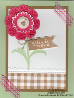 Here is a fun card. Lots of new product was used on this card made by Connie Tumm. The stamp set used is Happy Flowers...which just happens to coordinate with the 1/2" Circle, 3/4" Circle, 1" Circle, 1-1/4" Circle Punches [pg 182] and the Floral Framelits Dies [pg 187].